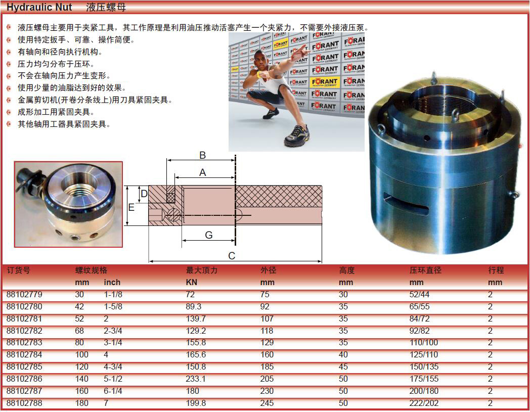 ·液压螺母主要用于夹紧工具,其工作原理是利用油压推动活塞产生一个夹紧力,不需要外接液压泵。 ·使用特定扳手、可靠、操作简便。 ·有轴向和径向执行机构。 ·压力均匀分布于压环。 ·不会在轴向压力产生变形。 ·使用最少量的油脂达到最好效果。 ·金属剪切机(开卷分条线上)用刀具紧固夹具。 ·成形加工用紧固夹具。 ·其他轴用工器具紧固夹具