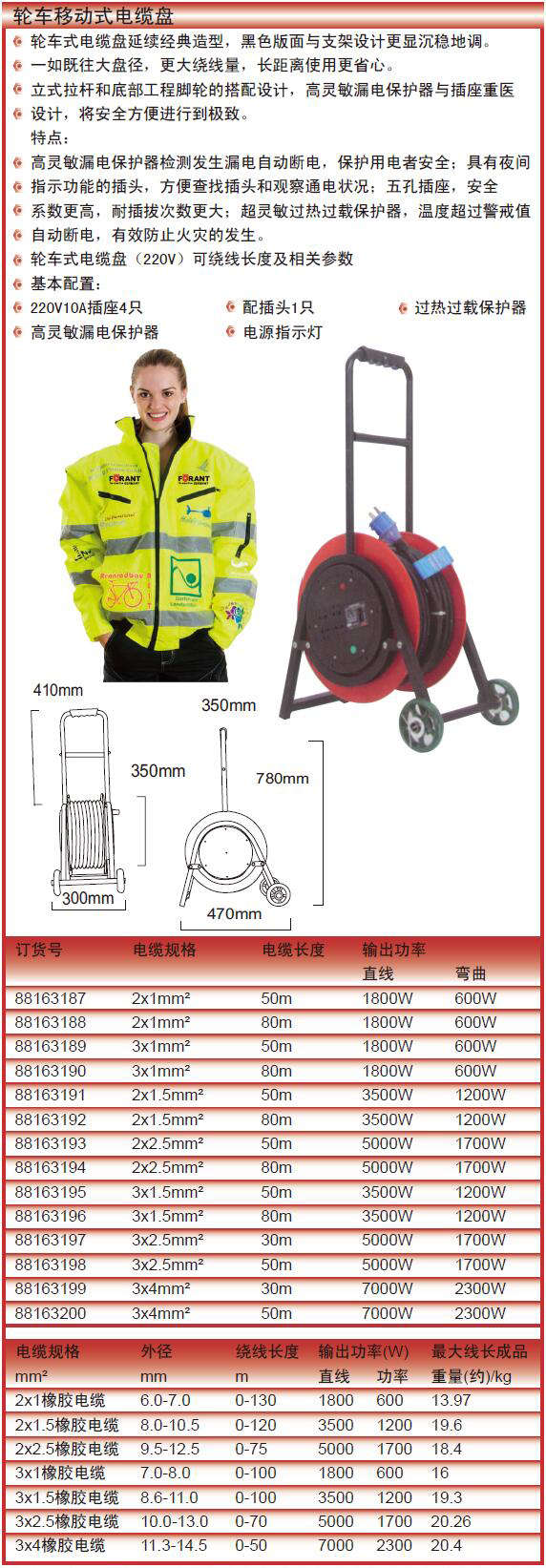 ·轮车式电缆盘(220V)可绕线长度及相关参数