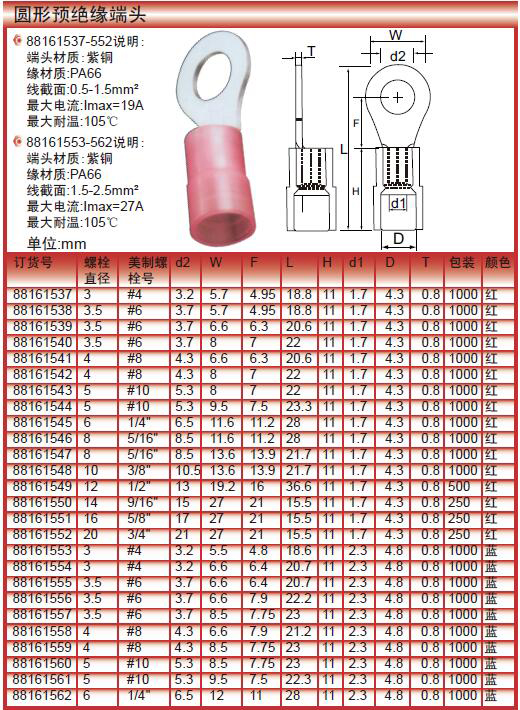 订货号 制造商型号 适用线径 电流 描述 美制螺栓号 d2 W F L H D T 包装 螺栓直径 价格 购物车
