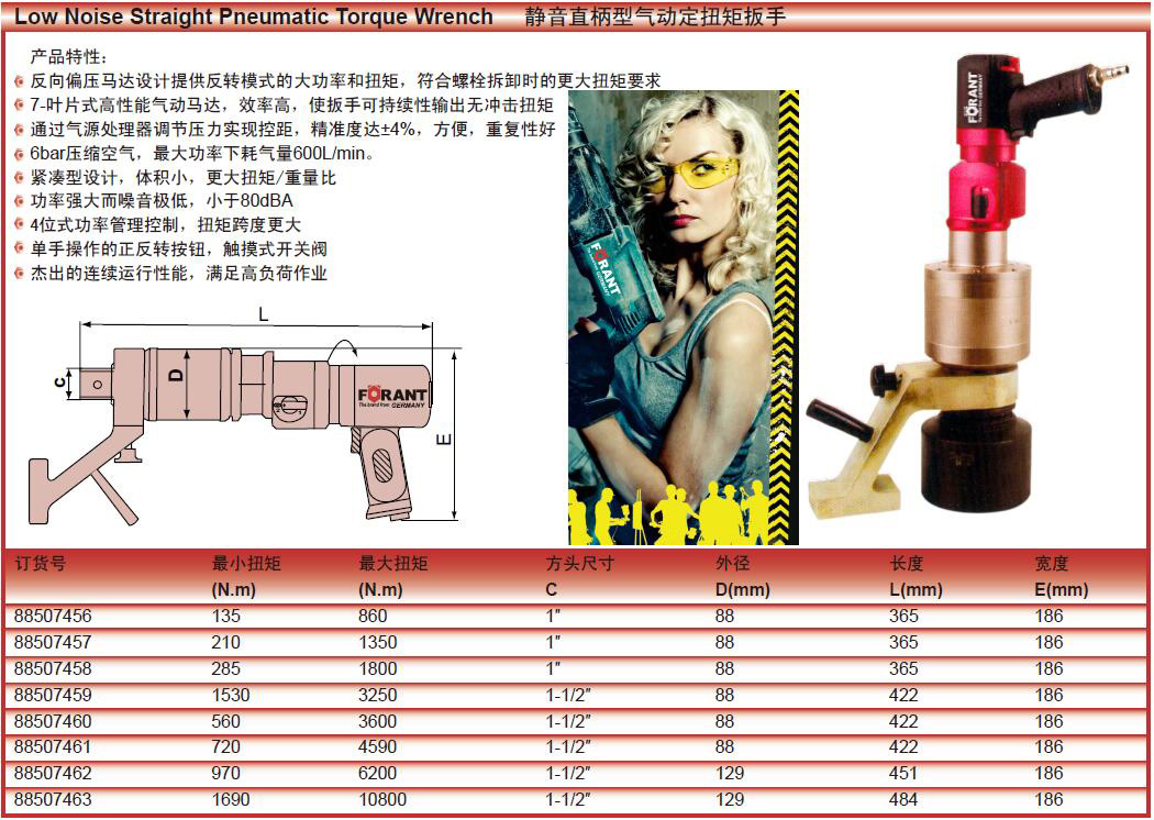 订货号 制造商型号 驱动方头 空转转速 扭力范围 最大扭力 手柄形式 带负载耗气量 工具长度 净重 进气口接头尺寸 外径D 宽度E 价格 购物车