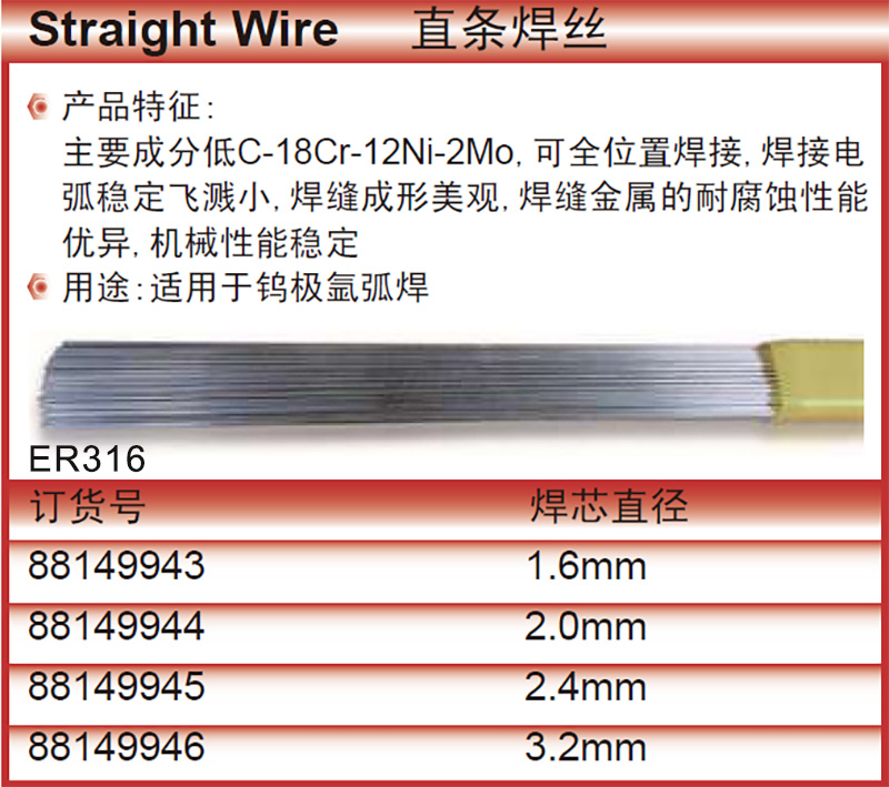 ·主要成分低C-18Cr-12Ni-2Mo,可全位置焊接,焊接电弧稳定飞溅小,焊缝成形美观,焊缝金属的耐腐蚀性能优异,机械性能稳定
