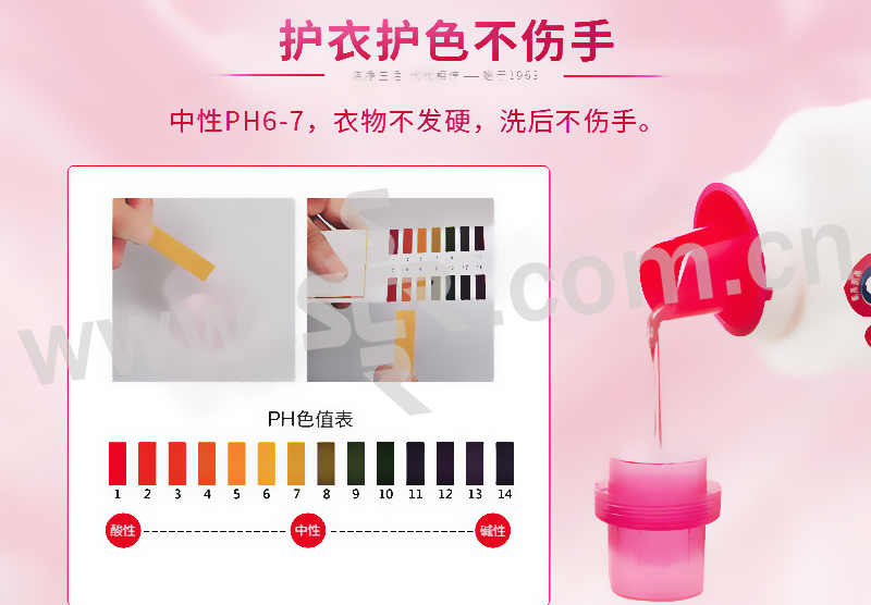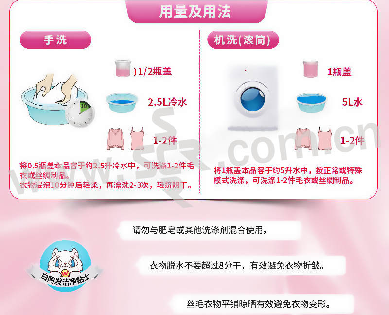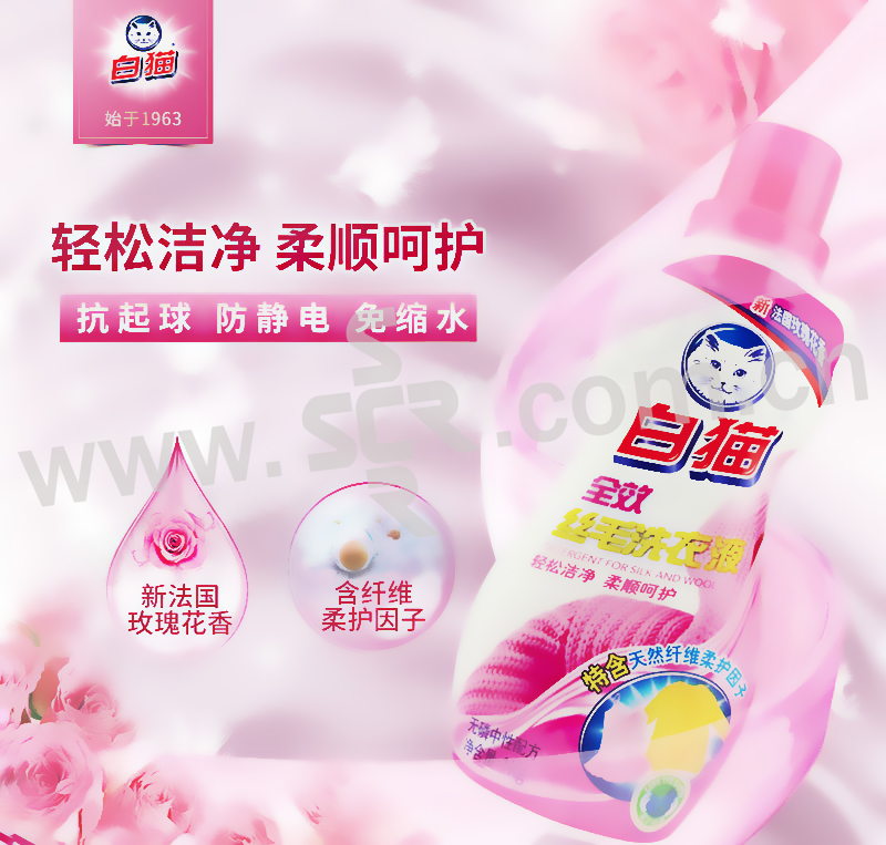 ·轻松洁净,柔顺呵护 1.丝绸和羊毛等高级织物可用的温和中性洗涤剂,洗涤,护理2效合一. 2.特含天然纤维柔护因子,洗后羊毛织物柔软蓬松,不易起球,丝绸织物柔滑飘逸,不易起皱. 3.芳香怡人,防静电,防缩水.