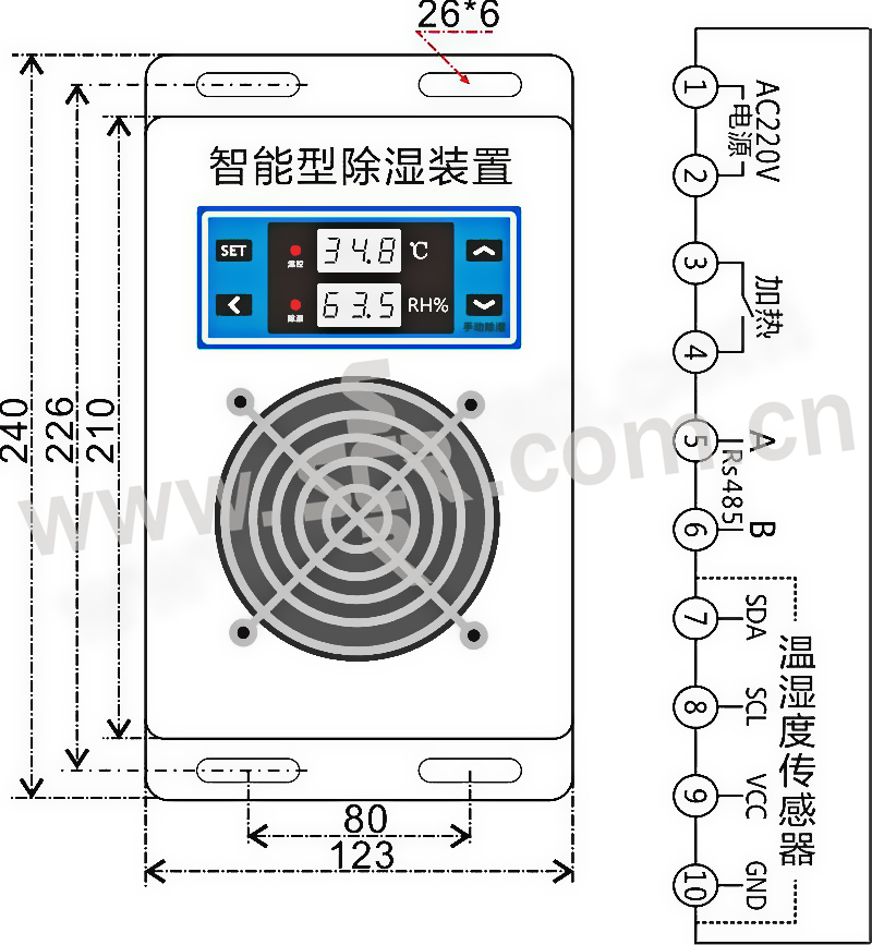 ·BH-CS810智能型除湿装置是采用半导体制冷除湿方式, 主动将密闭空间的潮湿空气在风扇的作用下吸入除湿风道, 空气中的水汽经过半导体制冷机构后冷凝成水, 再通过导水管排出柜体, 可以达到很好的除湿效果。 通过减低空气中含水量, 使相对湿度和绝对湿度同时下降, 几乎不提高温度, 不产生温差带来的负面影响, 从根本上杜绝或减少了事故的发生, 也不会因高温而加速柜内器件及柜体的老化。 智能型除湿装置把被动防止凝露方式,改为主动引导凝露,有效的防止柜内设备老化、 绝缘强度降低、 二次端子击穿、 材料霉变及钢结