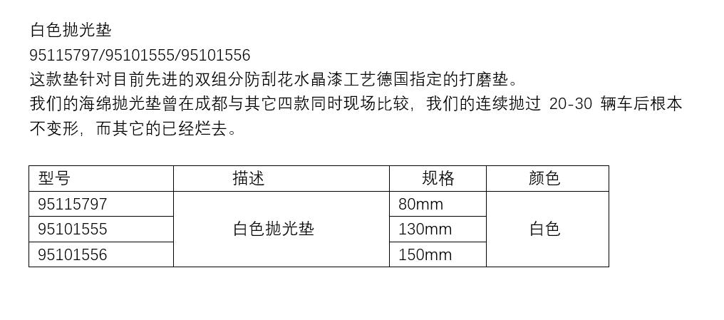 ·这款垫针对目前先进的双组分防刮花水晶漆工艺德国大众指定的打磨垫