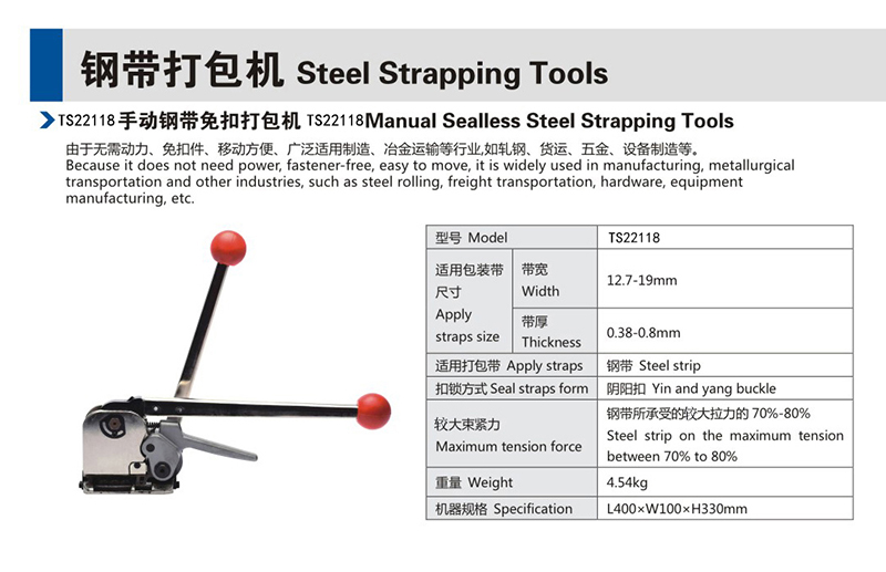 F43418 TS22118 打包机 钢带 12.7~19mm L400×W100×H330mm 0.38~0.8mm 阴阳扣 钢带所承受的最大拉力的70%~80% 4.54kg 3150.00