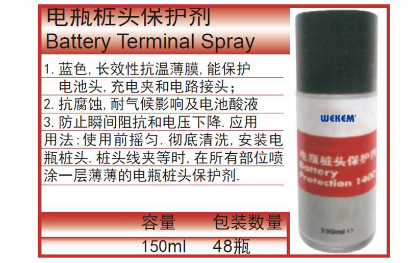 ·用法:使用前摇匀.彻底清洗,安装电瓶桩头.桩头线夹等时,在所有部位喷涂一层薄薄的电瓶桩头保护剂.