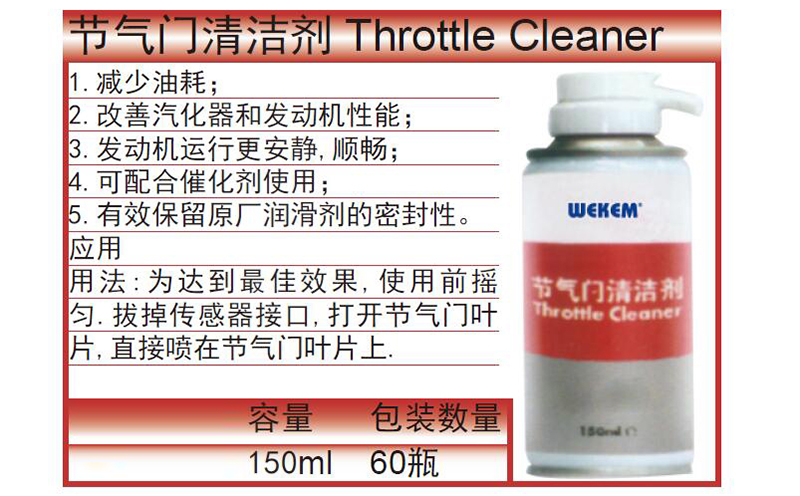 ·应用用法:为达到最佳效果,使用前摇匀.拔掉传感器接口,打开节气门叶片,直接喷在节气门叶片上.