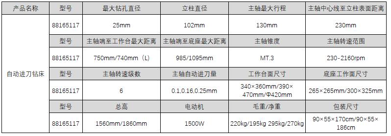 订货号 制造商型号 最大钻孔直径 立柱直径 主轴最大行程 主轴轴线至立柱表面距离 主轴端至工作台面最大距离 主轴端至底座最大距离 主轴锥度 主轴转速范围 主轴转速级数 工作台面尺寸 底座工作面尺寸 电动机功率 额定电压 净重 主轴自动进刀量 总高 包装尺寸 价格 购物车